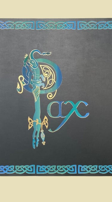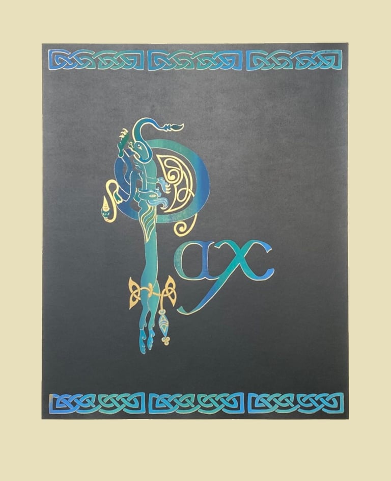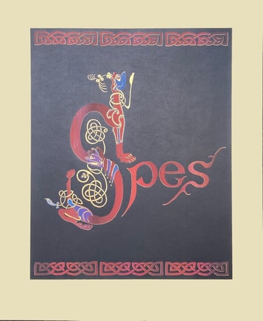 My inspiration for this design came from the illuminated pages of the Book of Kells, where zoomorphics/animals were often used to illustrate the first letter of a passage or paragraph. Using an uncial style font, the letter A is formed by two intertwining dogs